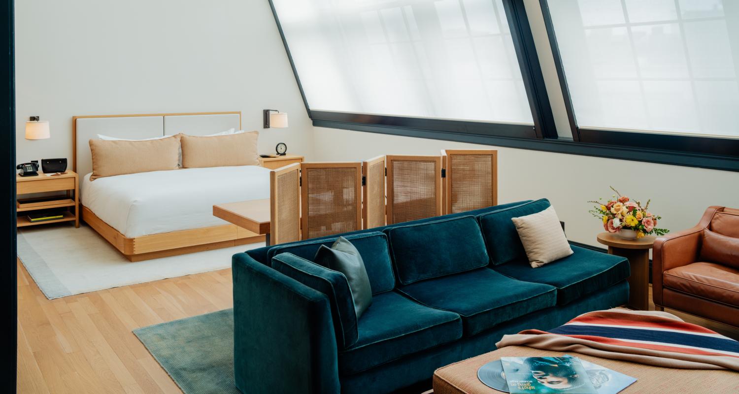 A true stunner. The coveted Canfield Suite is framed by breathtaking atelier windows and 20-foot ceilings. Perfect for the ultimate night in, The Canfield features a deep soaking tub, dining area with wet bar and Shinola turntable—so you can set the mood while lounging by the fireplace.